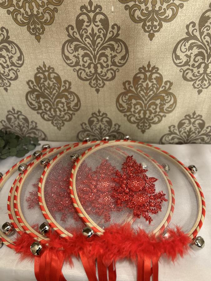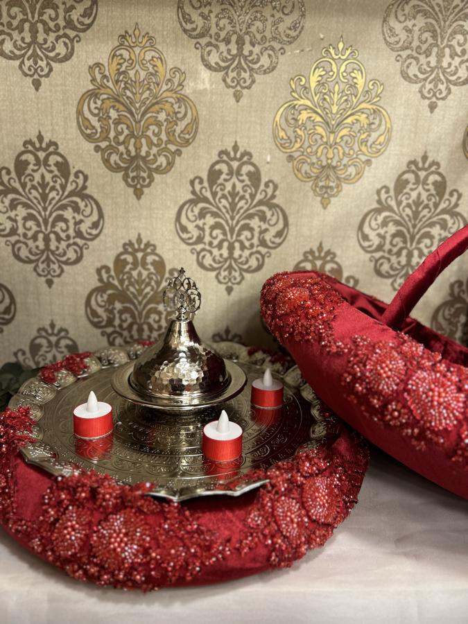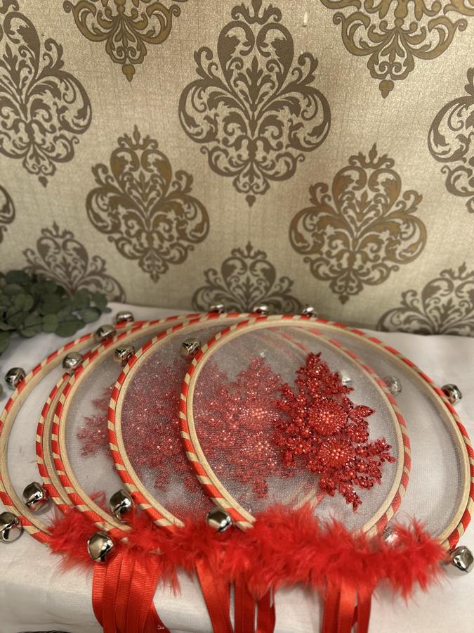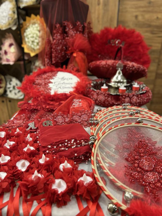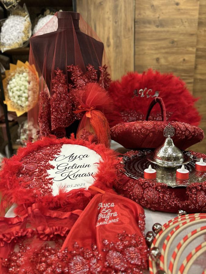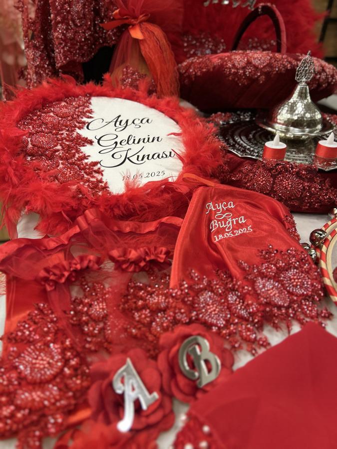 Set içerisinde; -Geniş işlemeli gelin duvak -Gelin kuşak, 2 eldiven, 2 el gülü -İşlemeli gelin tefi -Kırmızı saten vip gelin mendili isimli -İsimli yelpaze -10 adet işlemeli nedime kasnak tefi -10 adet incili halay mendili -10 adet ledli halay mendili -Testi ▪️Ürünleri Kırmızı, Bordo, Lacivert, Yeşil, Beyaz,Siyah,Gold renklerini tercih edebilirsiniz. Ürün üzerindeki detayları gold veya gümüş olarak isteyebilirsiniz.Siparişi tamamlarken açıklama kısmına ürünlerin üzerine yazılmasını istediklerinizi belirtiniz.