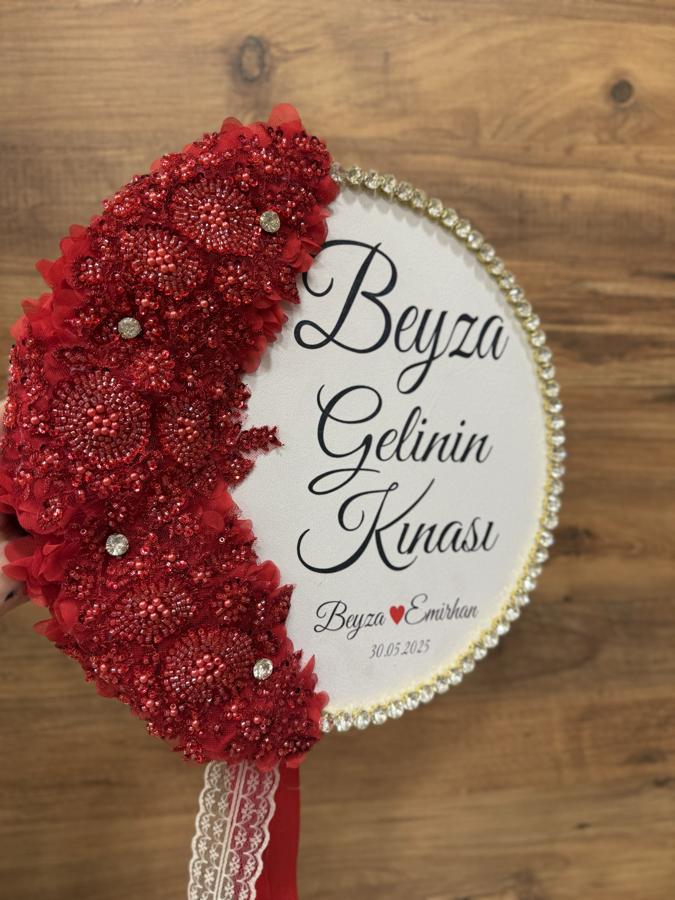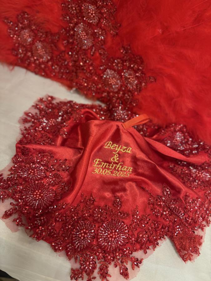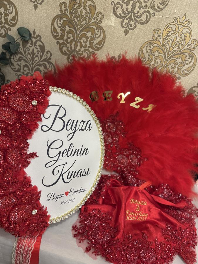 Set içerisinde; -Büyük boy isimli gelin yelpazesi -İşlemeli gelin tefi -İsimli saten gelin mendili bulunmaktadır. Kırmızı, bordo, lacivert, yeşil, gold, siyah, beyaz renklerinden de tercih yapabilirsiniz. Üzerine yazılmasını istediklerinizi açıklama kısmına belirtiniz.
