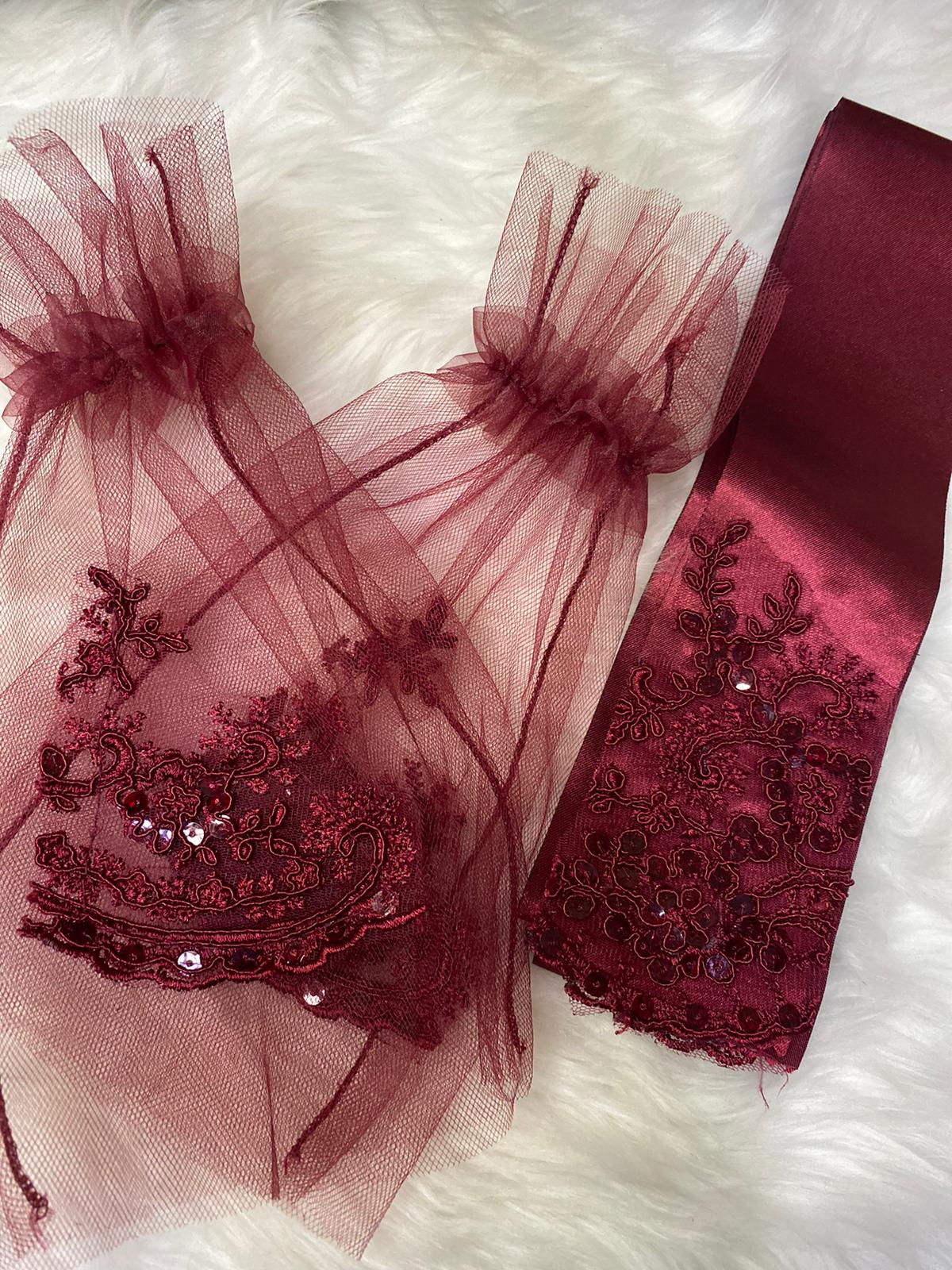 Duvak, kuşak, eldiven olarak üçlü settir.