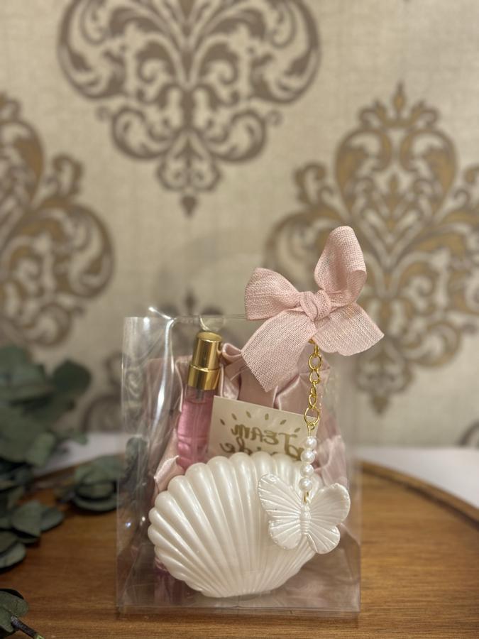 Şeffaf çanta içerisinde ; -Saten toka -Fısfıslı cam kolonya şişesi -İstridye mum -Bride team dövme -Anahtarlık bulunmaktadır.