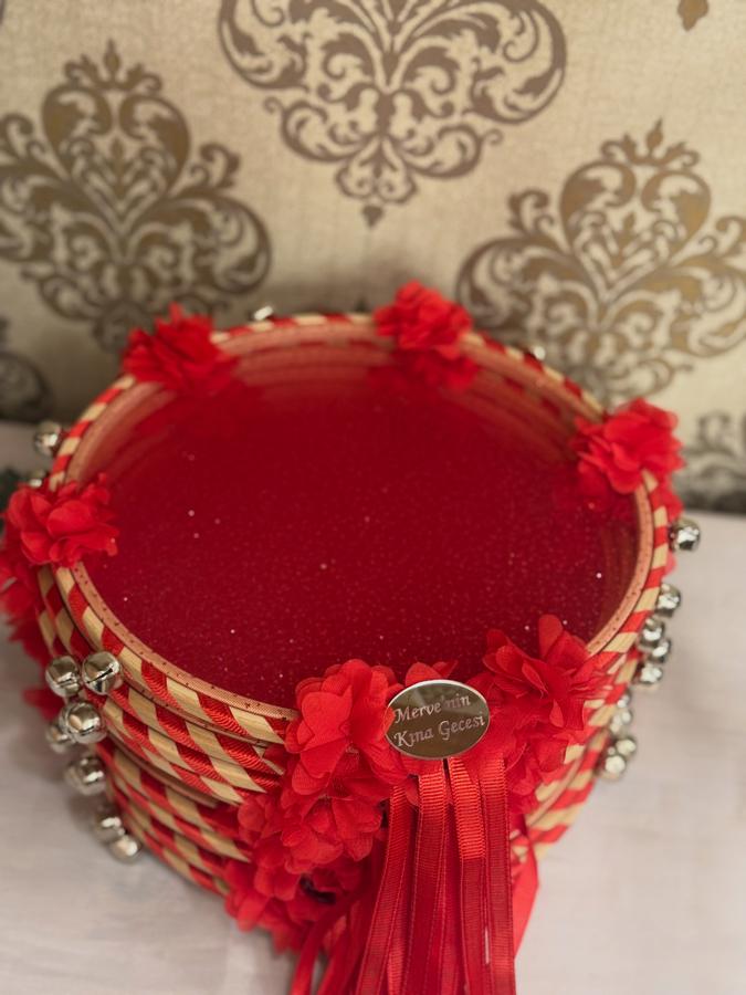 Kına seti içerisinde ; - Geniş işlemeli duvak kuşak eldiven el gülü set - İşlemeli sepet ve tepsi - Gelin tefi - 10 adet isim plakalı nedime tef - 10 adet ledli mum - İsimli takı kurdelesi bulunmaktadır. Aynı setin bordo, lacivert, yeşil, siyah renkleri de hazırlanabilir. Açıklama kısmına tef, nedime tefleri ve takı kurdeleleri üzerine yazılmasını istediklerinizi belirtiniz