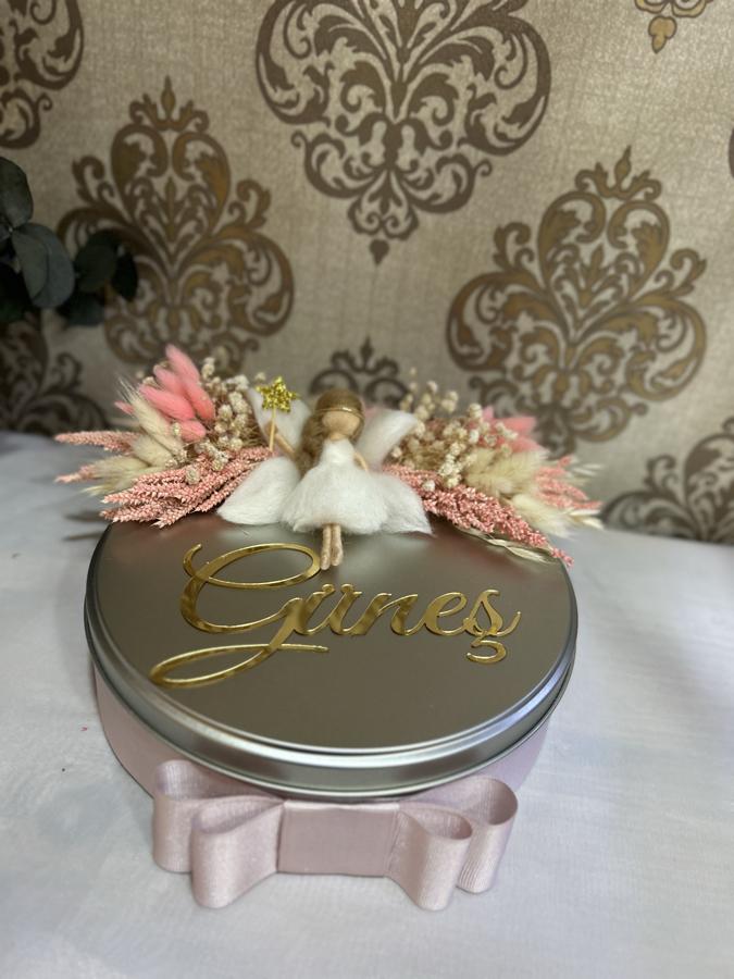 Metal kutu içerisinde 100 adet melodi marka çikolata ve drajeler mevcuttur. Kapağı peri bebek süslemelidir.Siparişinizi oluşturduktan sonra etiket seçimi için sizinle iletişime geçiyoruz.