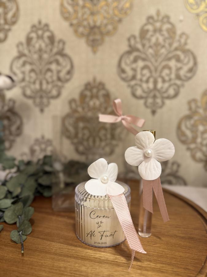 Şeffaf çanta içerisinde mika mum ve fısfıslı cam şişe bulunmaktadır. Şişe içerisinde Eyüp Sabri-Japon Kirazı kolonyası bulunmaktadır. Seçtiğiniz ürünlerde siparişi oluşturma süreci tamamlandıktan sonra bir örnek gönderilip daha sonrasında hazırlanmaya devam edilir