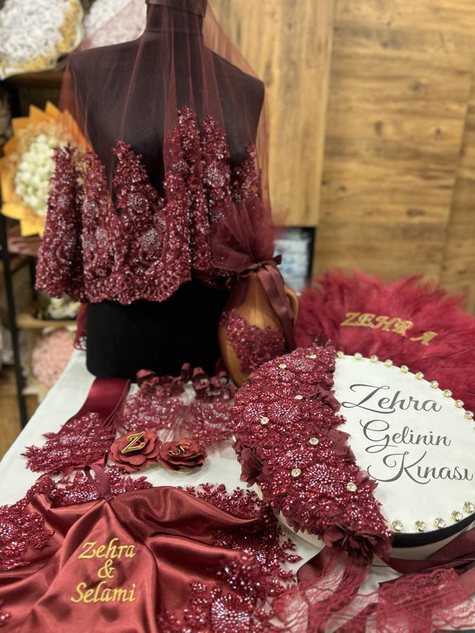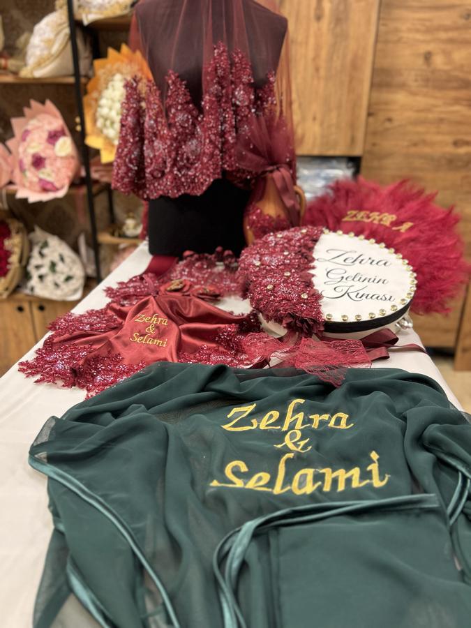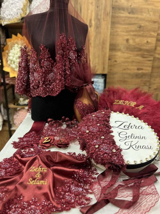 Set içerisinde; -Geniş işlemeli gelin duvak -Gelin kuşak, 2 eldiven, 2 el gülü -İşlemeli gelin tefi -Bordo saten vip gelin mendili isimli -İsimli yelpaze -İsimli damat örtüsü ,eldiven -Testi ▪️Kırmızı, Bordo, Lacivert, Yeşil, Beyaz,Siyah,Gold renklerini tercih edebilirsiniz. Siparişi tamamlarken açıklama kısmına ürünlerin üzerine yazılmasını istediklerinizi belirtiniz.